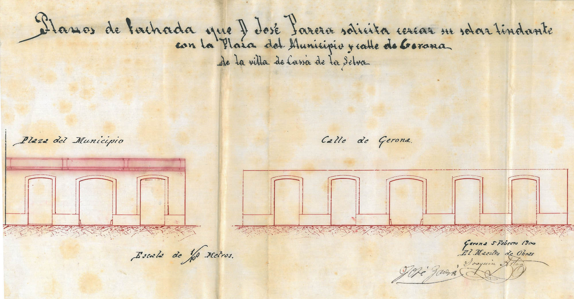 Sol·lcitud de permís de construcció d'unes tanques per a dues cases que donen una a la Plaça del Municipi i l'altre al carrer de Girona.